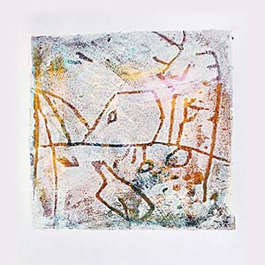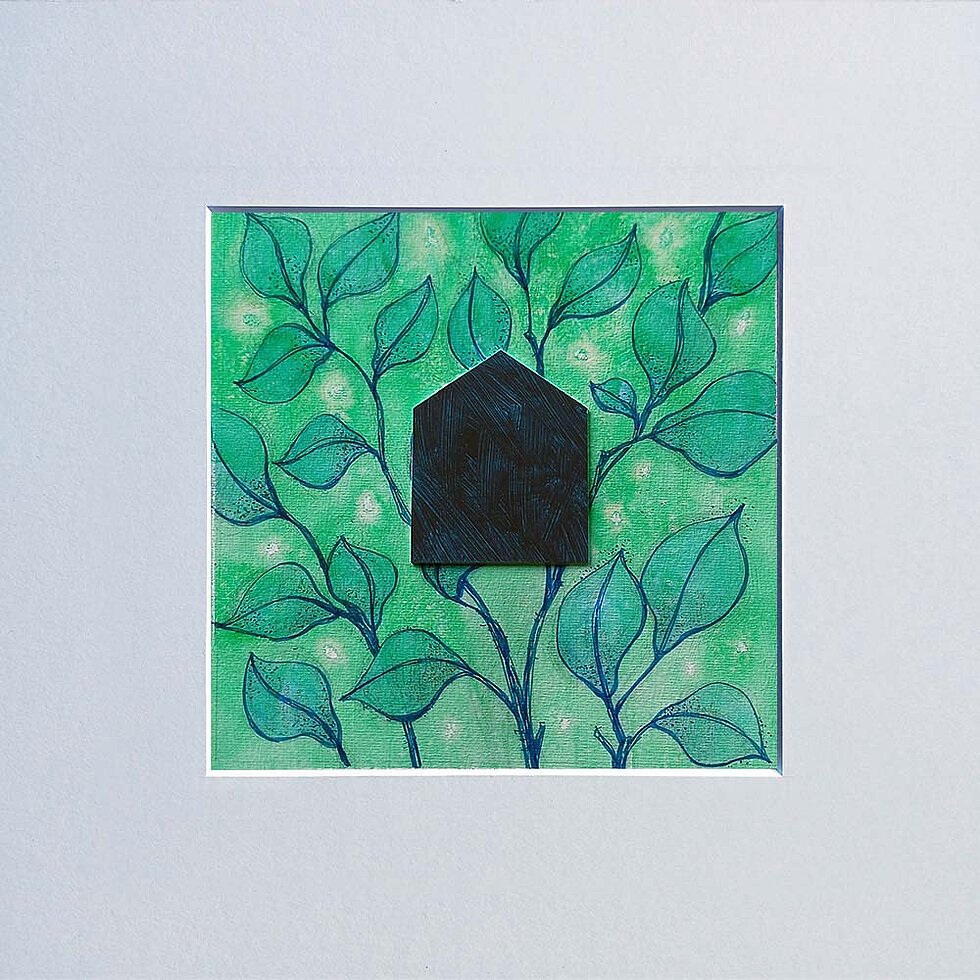 Zuerst "wächst" eine Zeichnung, angeregt durch die wunderbaren Formen von Ästen, Zweigen, Blättern, Knospen. Durch mehrmaliges übermalen entsteht im quadratischen Ausschnitt eine Art florales Ornament. Dazu kommt eine klar umrissene Form, als Kontrast und Überlagerung – eincollagiert als extra Karton. Erst dadurch wird die Zeichnung zur "Träger-Folie" für eine neue Ebene, die formt und dominiert.
